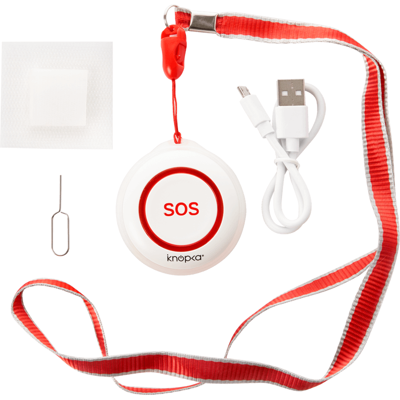 Помимо самой кнопки вызова, стандартная комплектация предусматривает наличие шнурка для переноски, двухсторонней липучки для крепления на вертикальных и горизонтальных поверхностях, USB-шнур для зарядки.